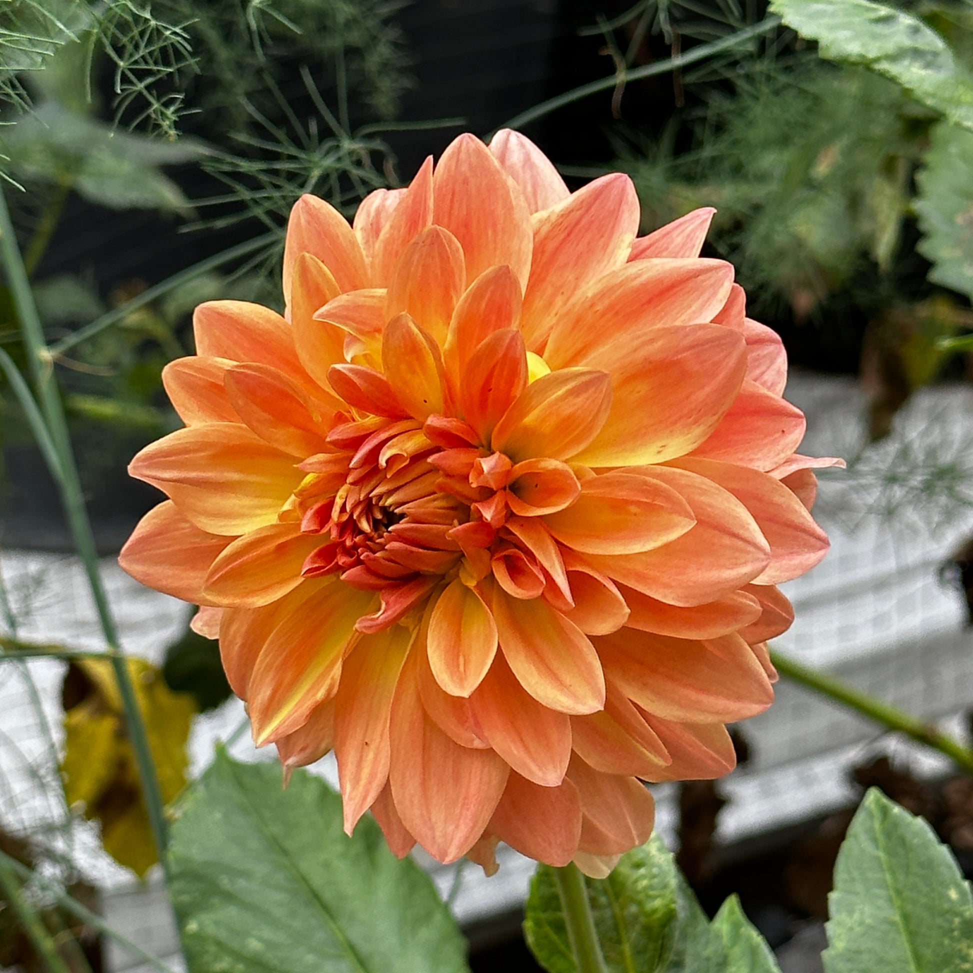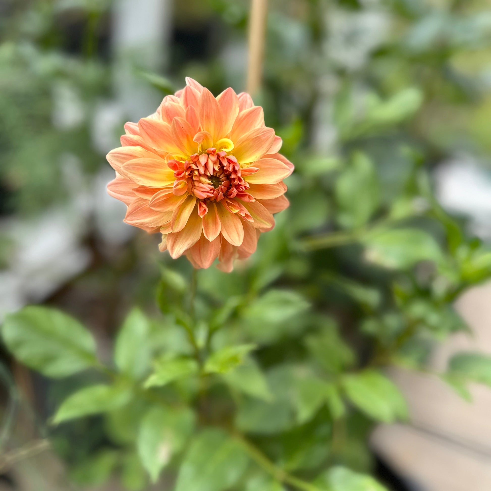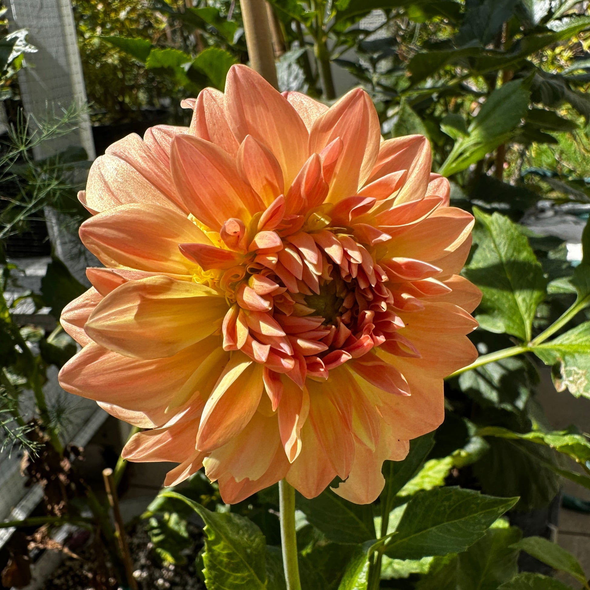 Hamilton Lillian is a great small formal decorative cut flower that comes in orange-peach with flecks of yellow highlight tones, that can fade lighter in warmer weather and later as it opens up. It runs on the shorter side, but for us worked fine as a cut flower, and can grow longer stems if you cut deeply and pinch early.