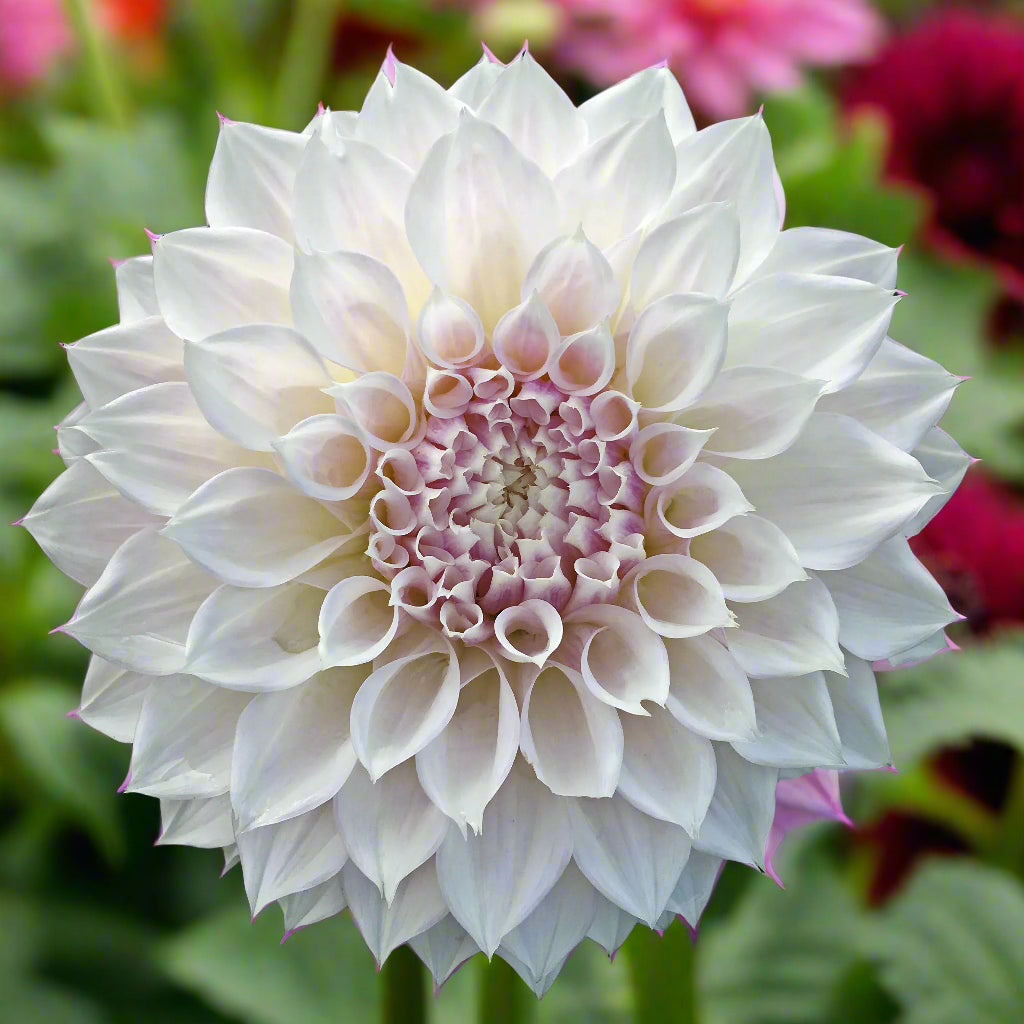 Soft white beautiful blooms with a hint of blush at the center, this beauty grows about 3.5-4' tall and 4-6" formal decorative blooms that are a florist / floral designer dream. Perfect cut flower for weddings, bridal bouquets, or other arrangements.