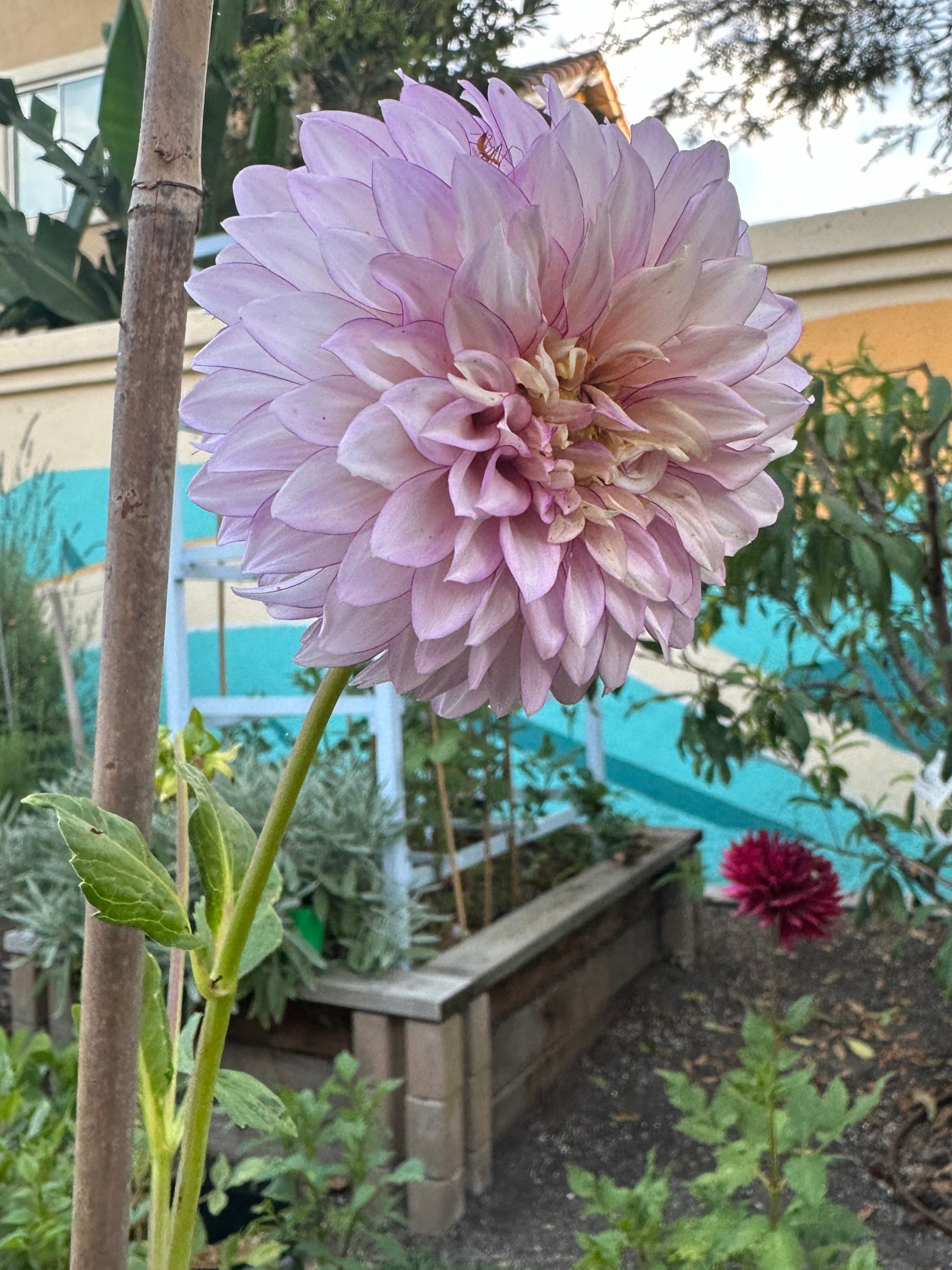 This beautiful flower is a medium (5-7") light blend informal decorative that tends toward light purple/white tones. She came to us via an auction fundraiser in 2023 and we were so excited to have her. She has very ruffled petals in the best way that you can hope for with an informal decorative, and we just wish we had captured a good photo of her this year, but hope these photos give you a sense of what she looked like in our garden this year. She tends to have almost a picotee edging of purple along its petals. She grows about 4' tall for us.